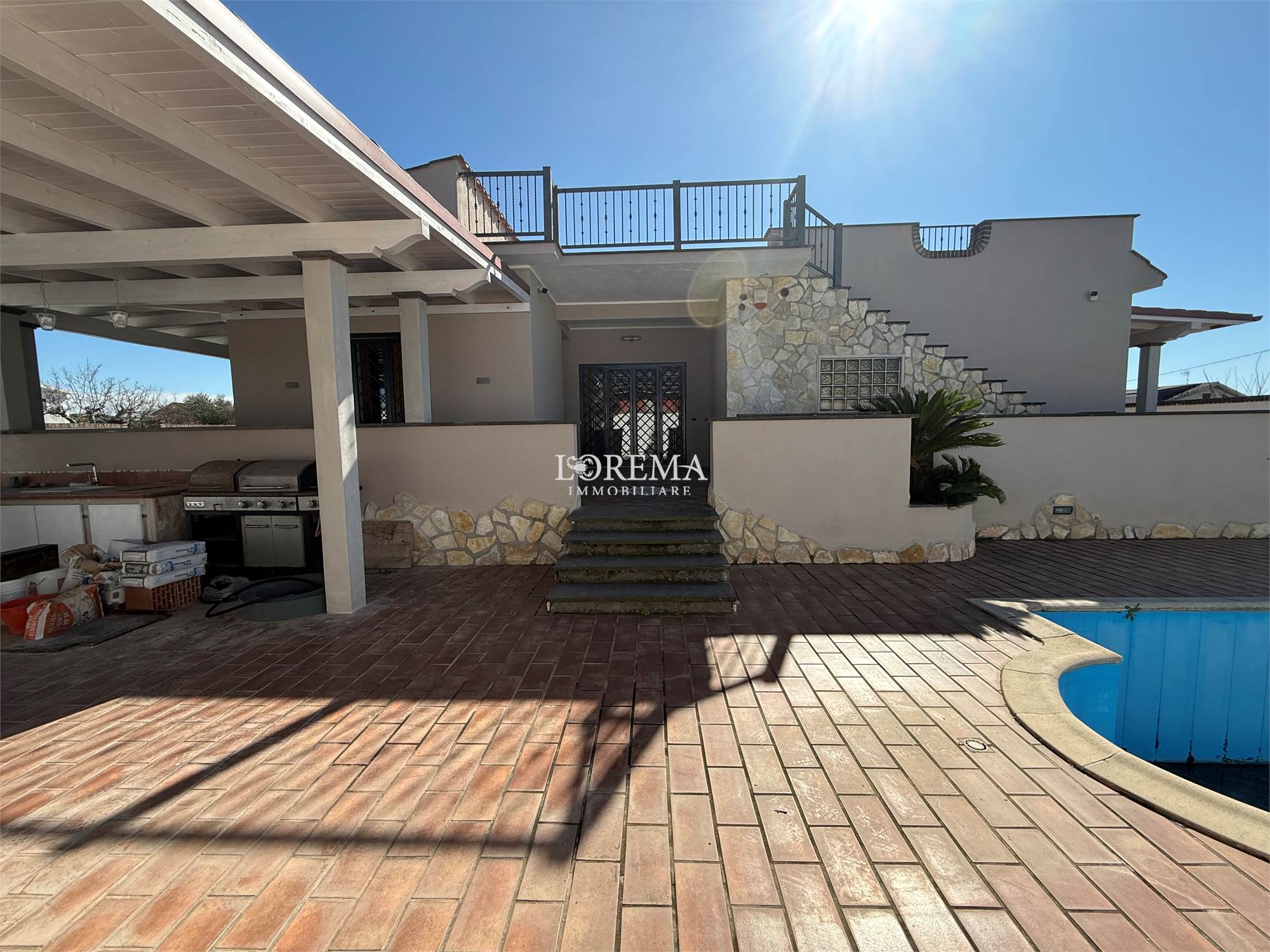ARDEA, NUOVA FLORIDA, nel polmone residenziale di Ardea, con scuole, servizi e negozi nelle vicinanze, mezzi di trasporto a 300 mt., precisamente in Via Capri proponiamo una Splendida Villa Unifamiliare di con 360 mq.ca., disposta su 2 Livelli, piano rialzato ed inferiore, stato interno ed esterno ottimo, con giardino privato perimetrale di 1000 mq.ca. con piscina 7X3 interrata, 1 bagno, 1 ripostiglio esterno, 1 cucina in muratura e ripostigli dispensa, ampio garage privato con cancello automatico.