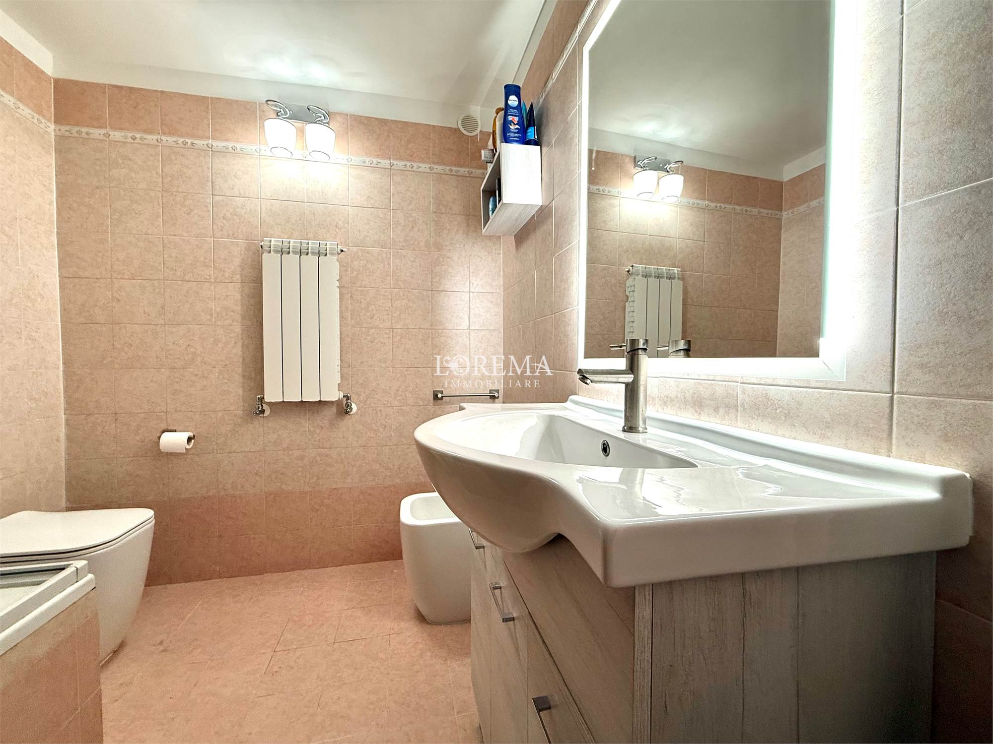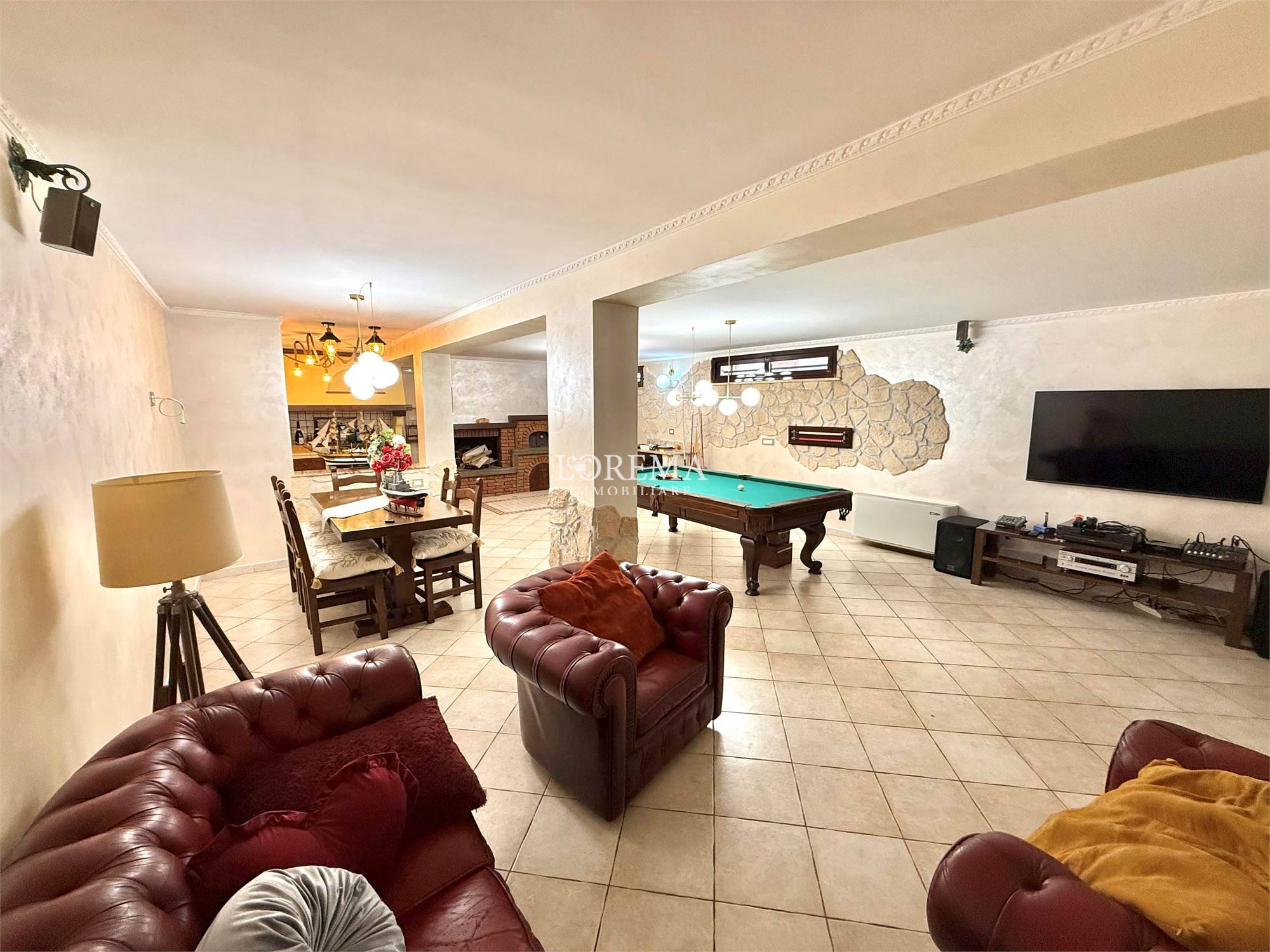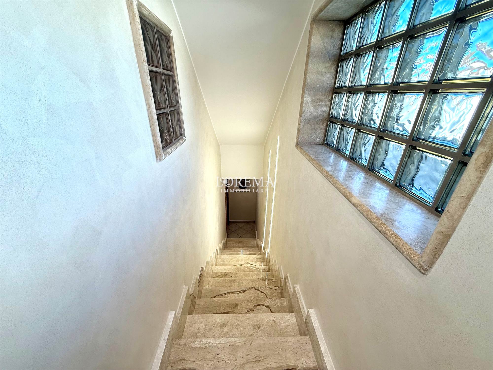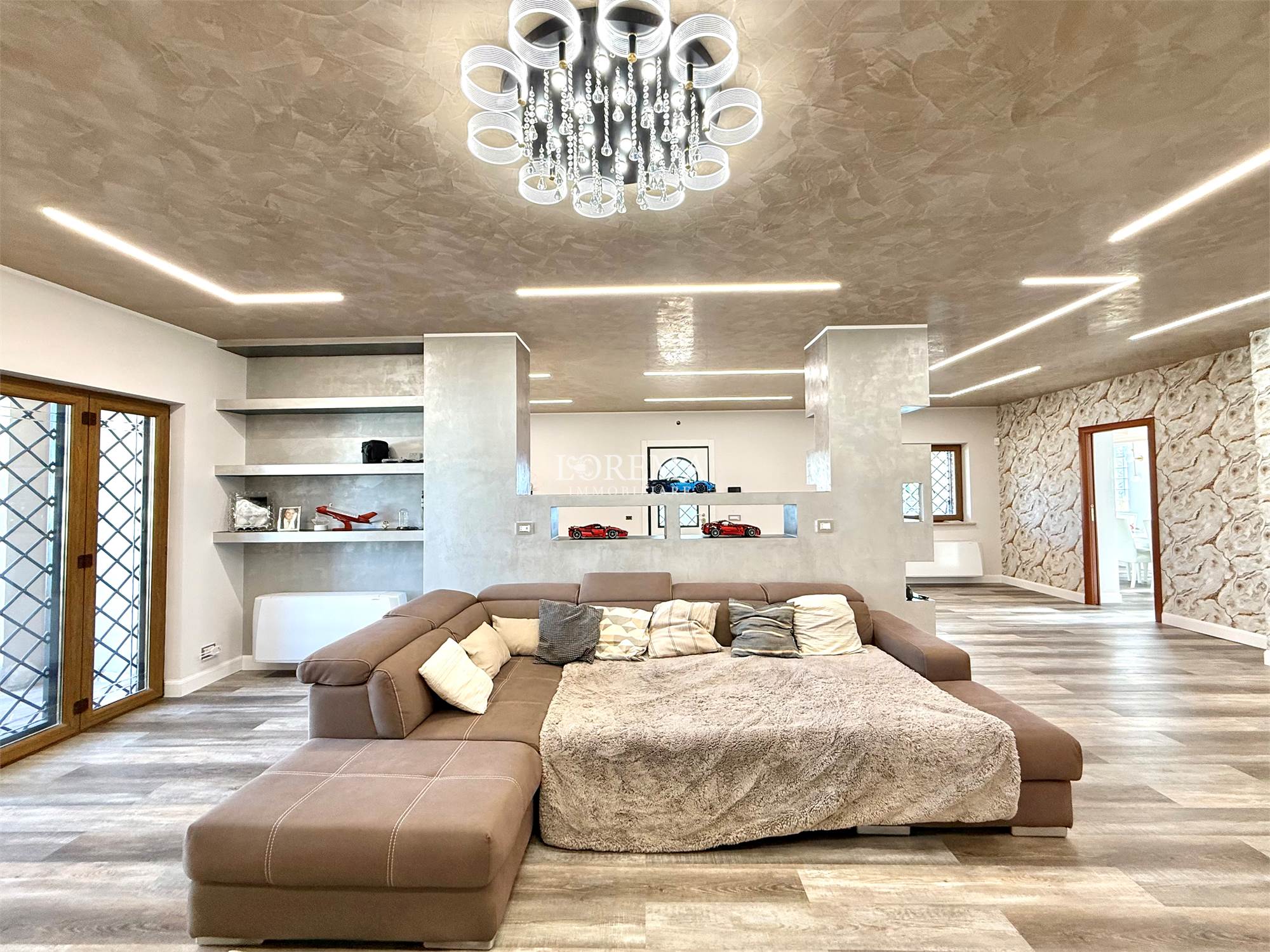 di 21 mq.ca, 1 camera di 12 mq.ca. con pompa di calore caldo/freddo, adibita a palestra con sauna e doccia, garage di 9,10 x 3,50 (31 mq.) e laboratorio con pompa di calore caldo/freddo, con serranda elettrica, quadro elettrico, Luci emergenza, intercapedine ispezionabile, Centrale elettrica.