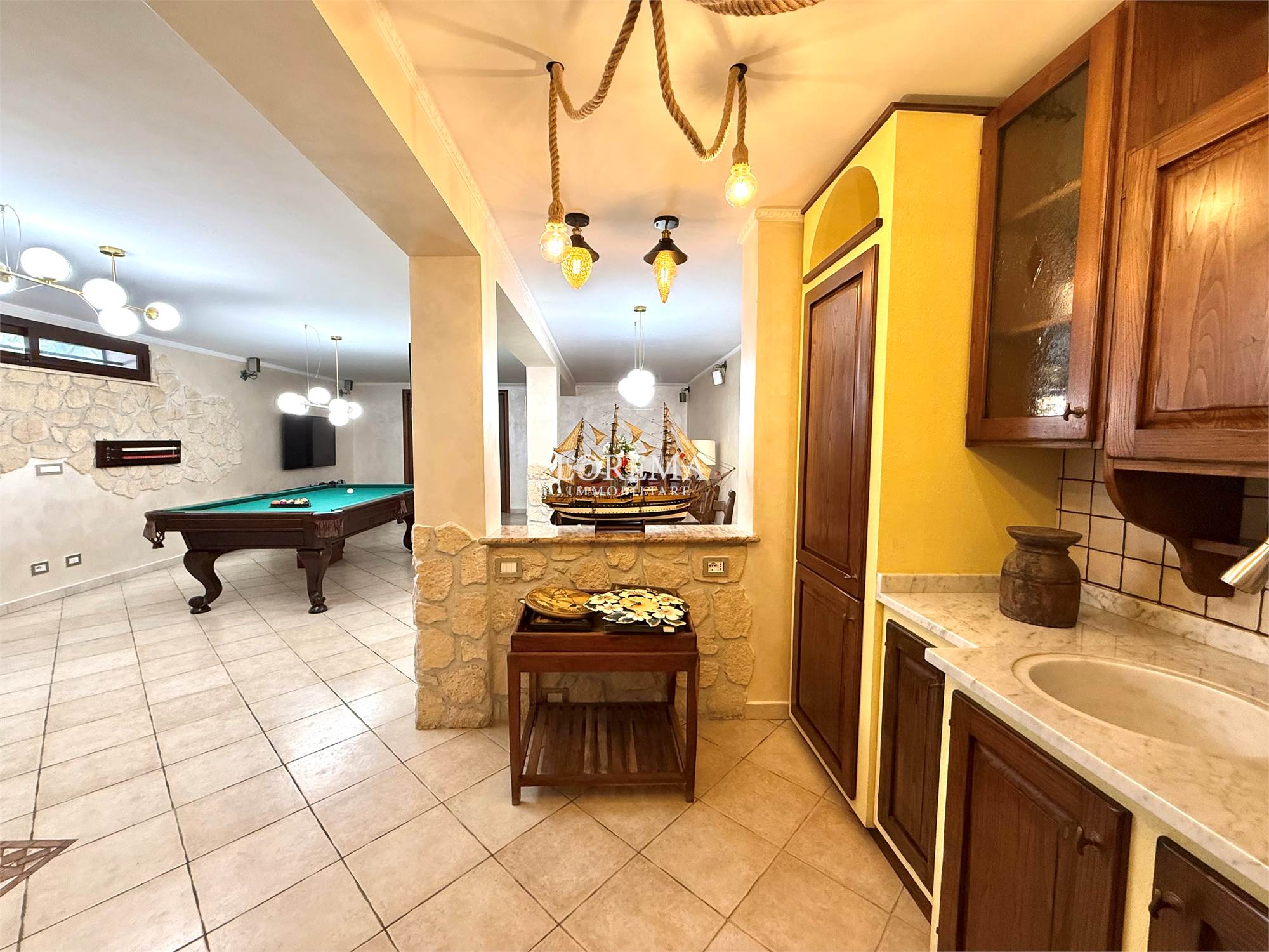 Al piano inferiore di 150 mq.ca. con altezza di 2.50, raggiungibile con una scala in marmo Daino Reale, troviamo un ingresso angolare, Sala hobby di 60 mq.ca, con camino, forno a legna e cucina a vista in muratura con marmo di Carrara e fornelli a gas, con 2 finestre alte, impianto surround sound, corridoio, lavanderia di 7 mq.ca con lavello e attacchi lavatrice, con tubo di collegamento col piano superiore per passaggio biancheria, 1 bagno con doccia ed aspiratore, 1 sala dispensa con accesso al ripostiglio, 1 camera con finestre alte