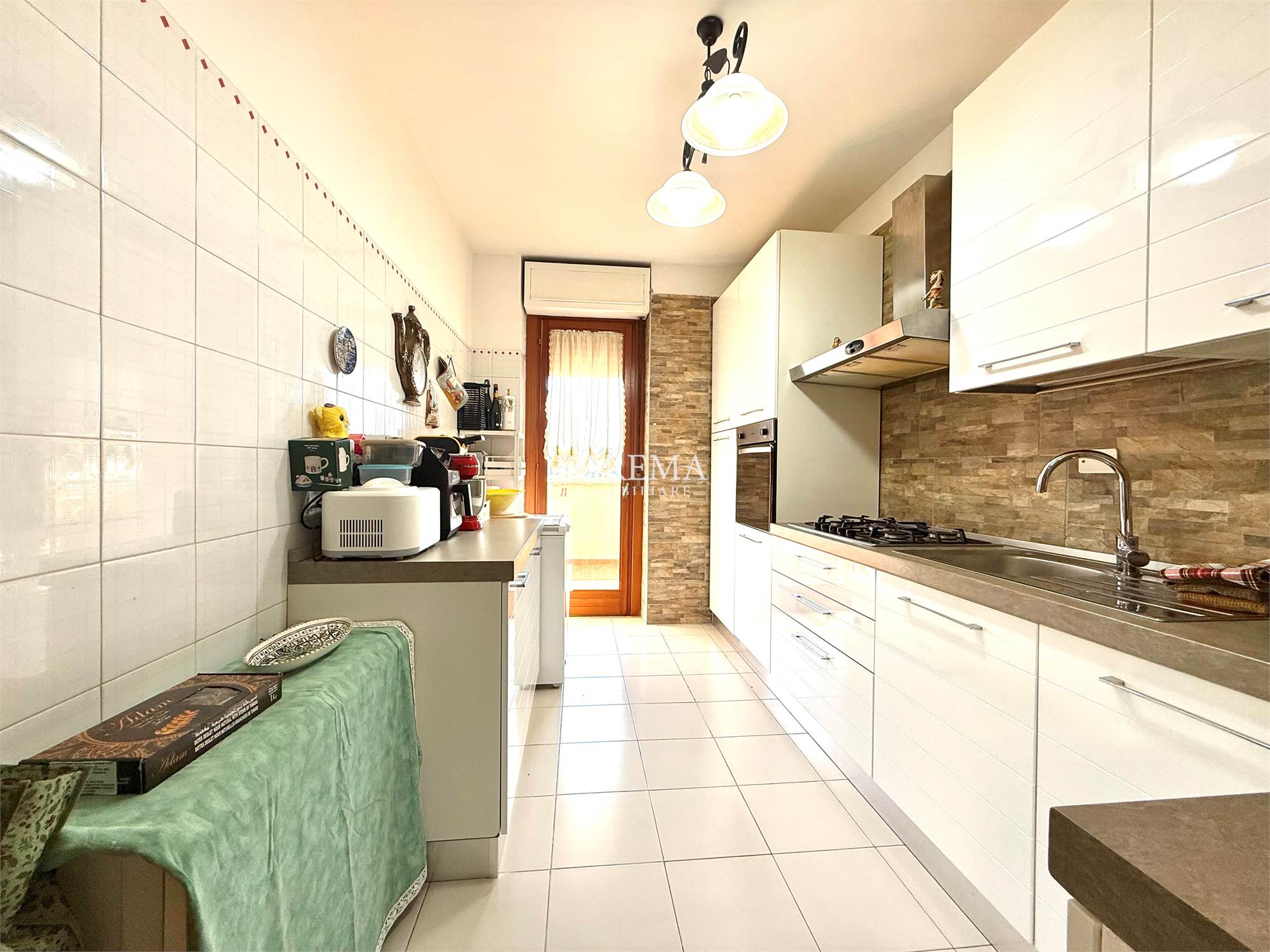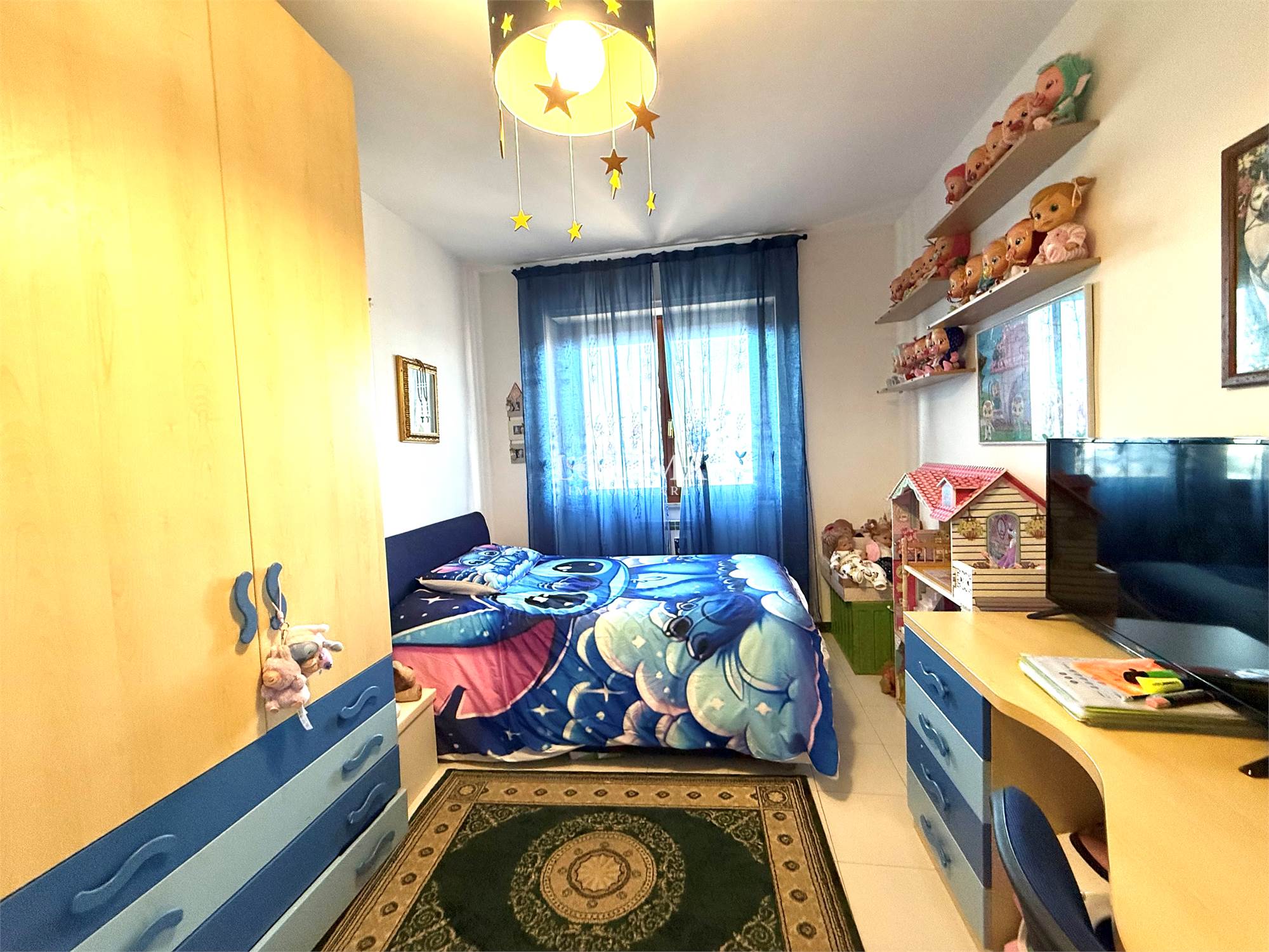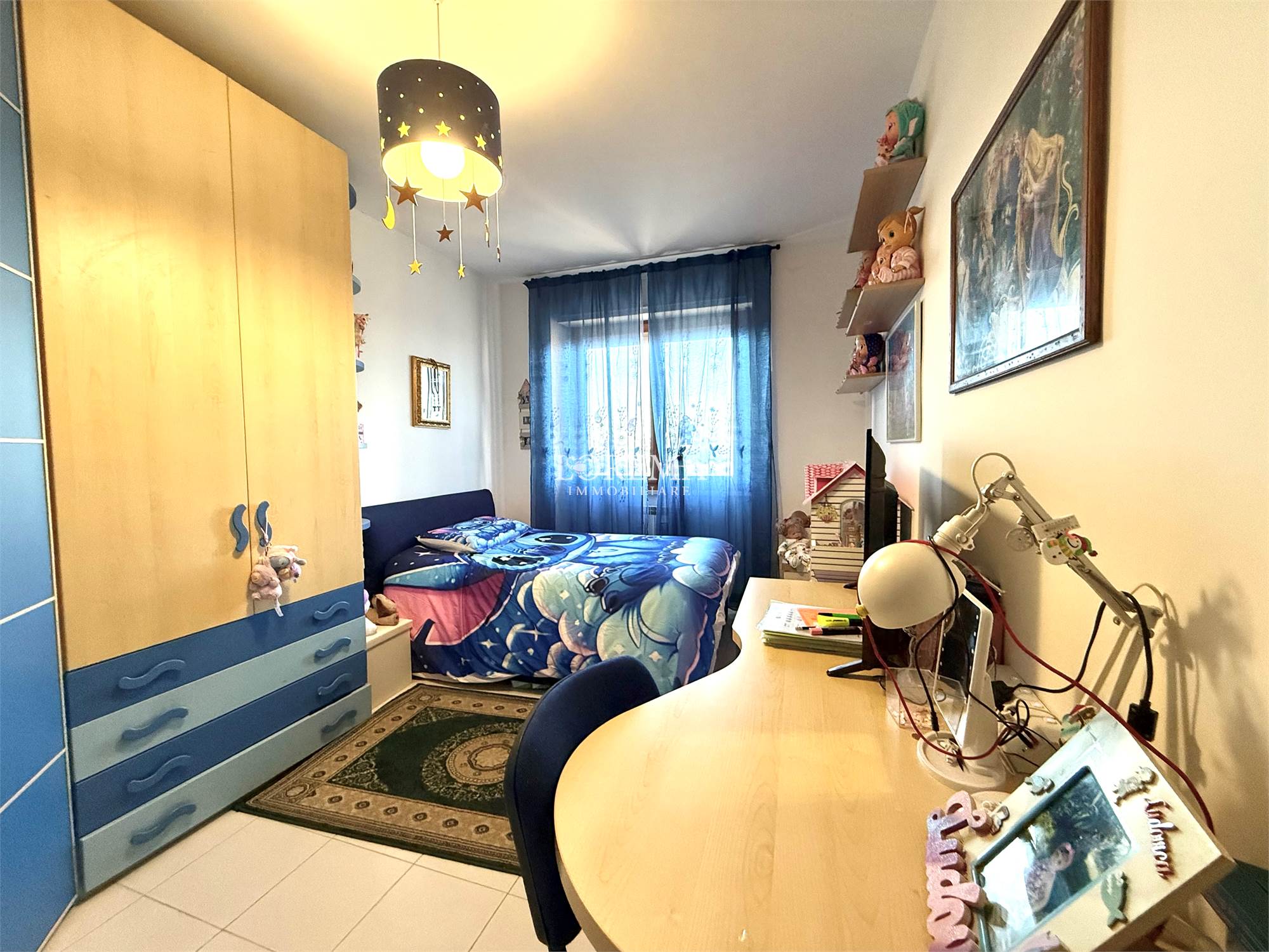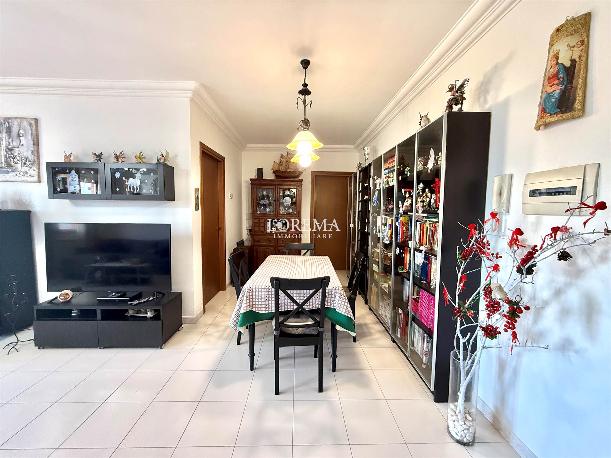 L'immobile molto luminoso con esposizione a Sud è composto da: Salone a vista, Cucina semi-abitabile, corridoio, 3 camere (2 matrimoniali, 1 cameretta), 2 bagni (1 con vasca, finestra e attacchi lavatrice e 1 di servizio senza finestra).