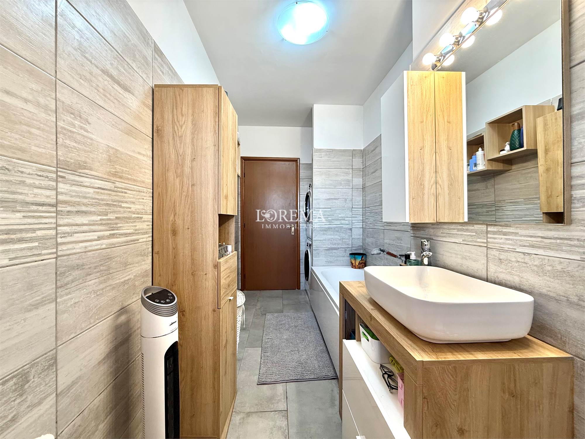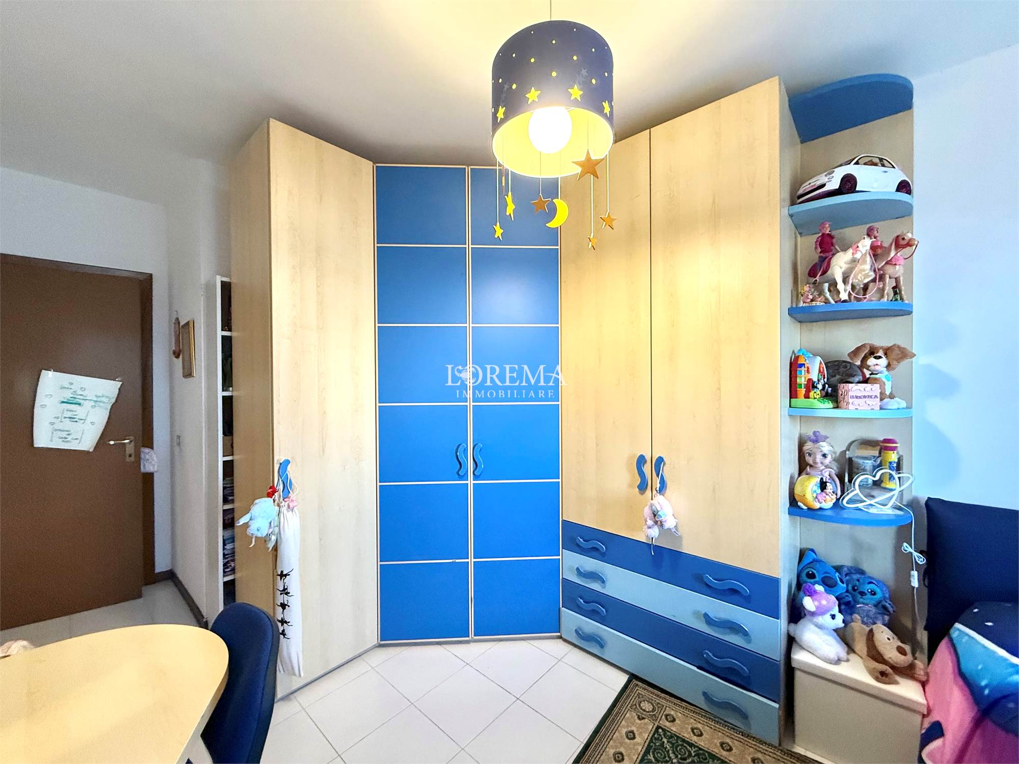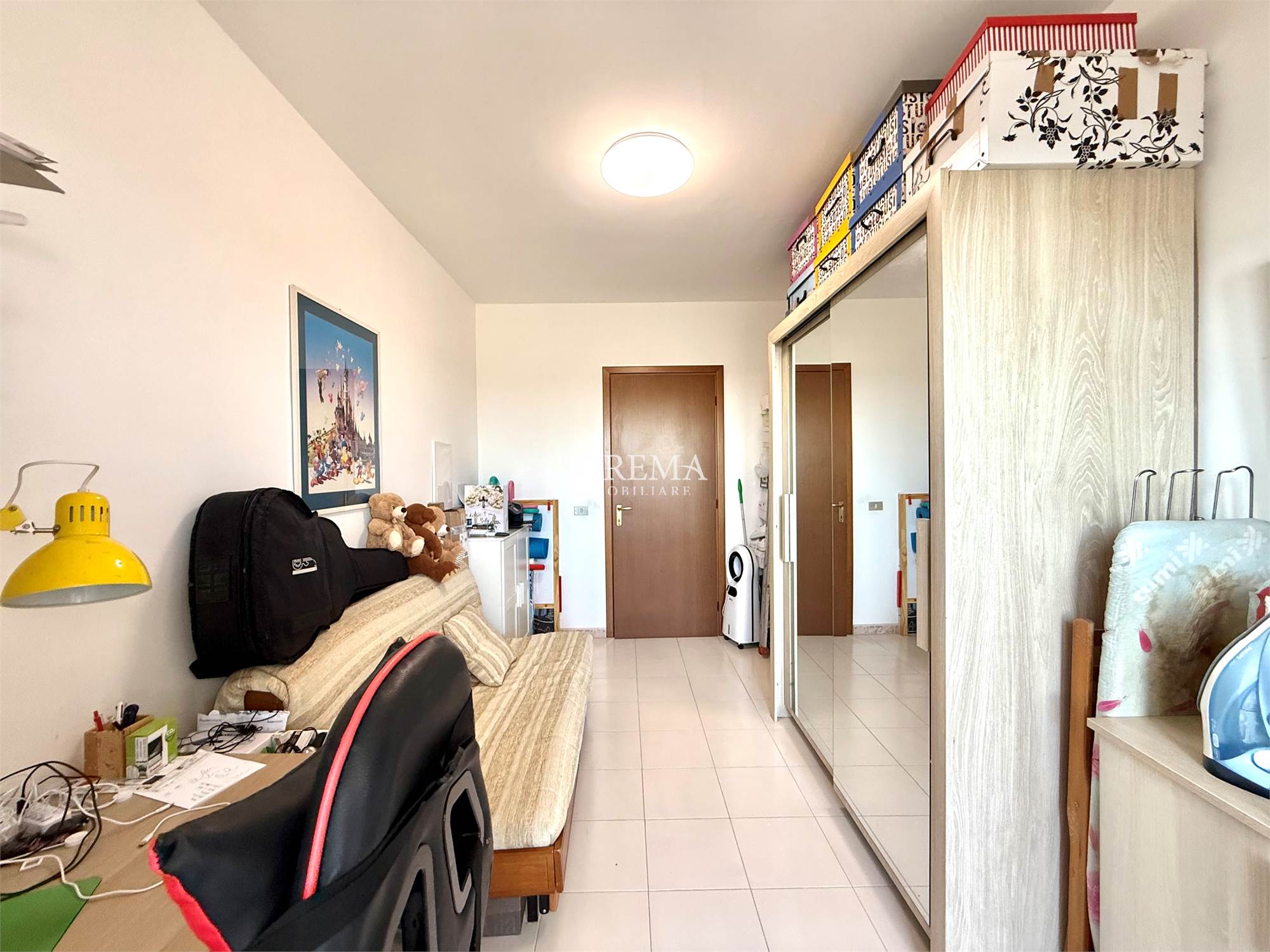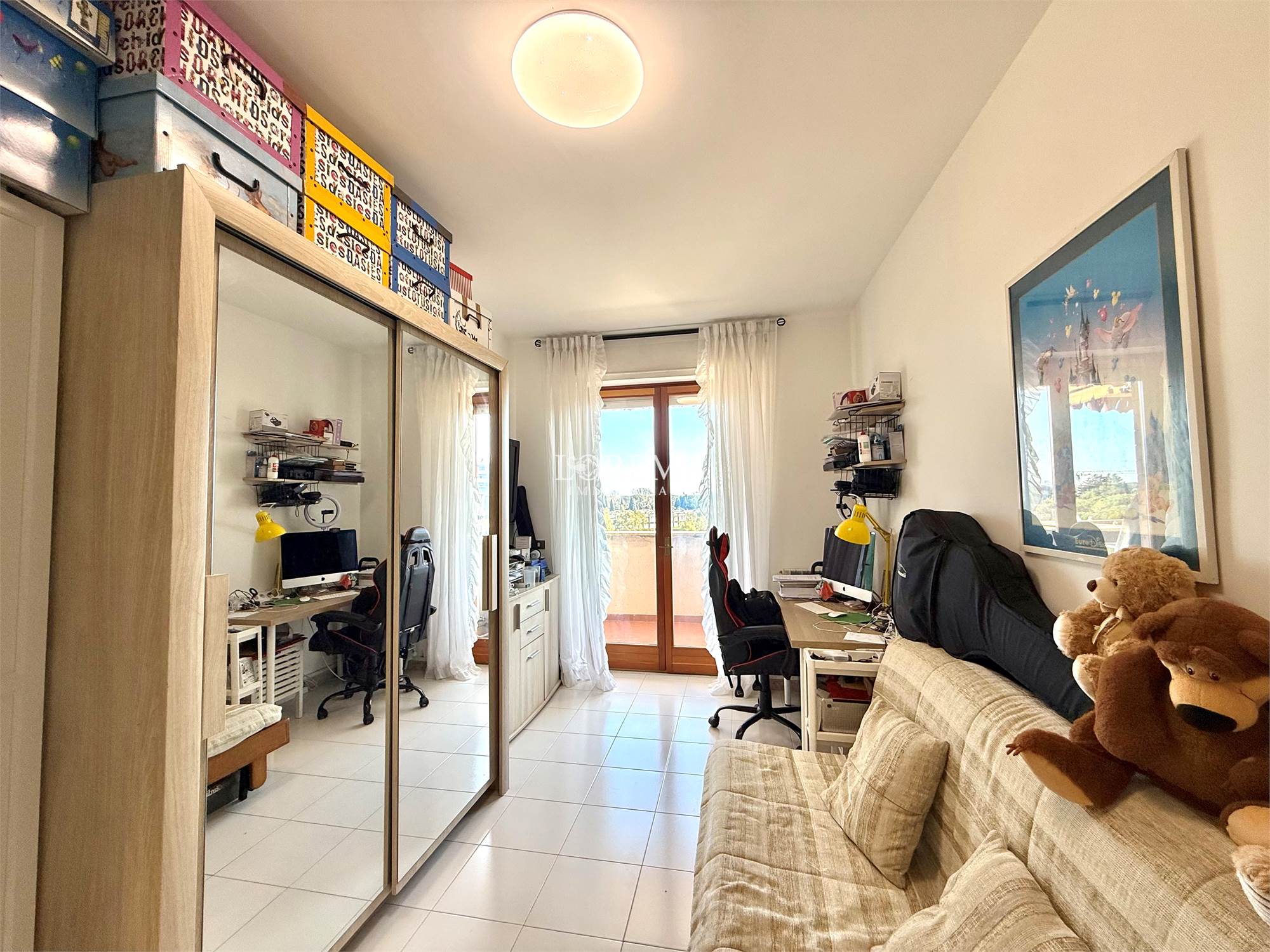 L'immobile molto luminoso con esposizione a Sud è composto da: Salone a vista, Cucina semi-abitabile, corridoio, 3 camere (2 matrimoniali, 1 cameretta), 2 bagni (1 con vasca, finestra e attacchi lavatrice e 1 di servizio senza finestra).