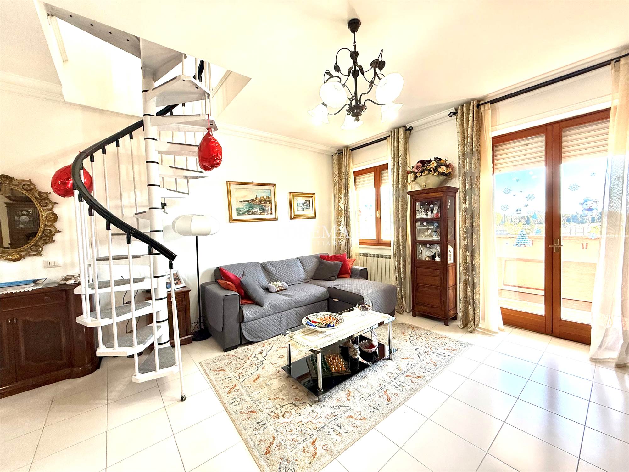 Con una scala a chiocciola si raggiunge un piccolo disimpegno, con accesso al grande terrazzo panoramico.